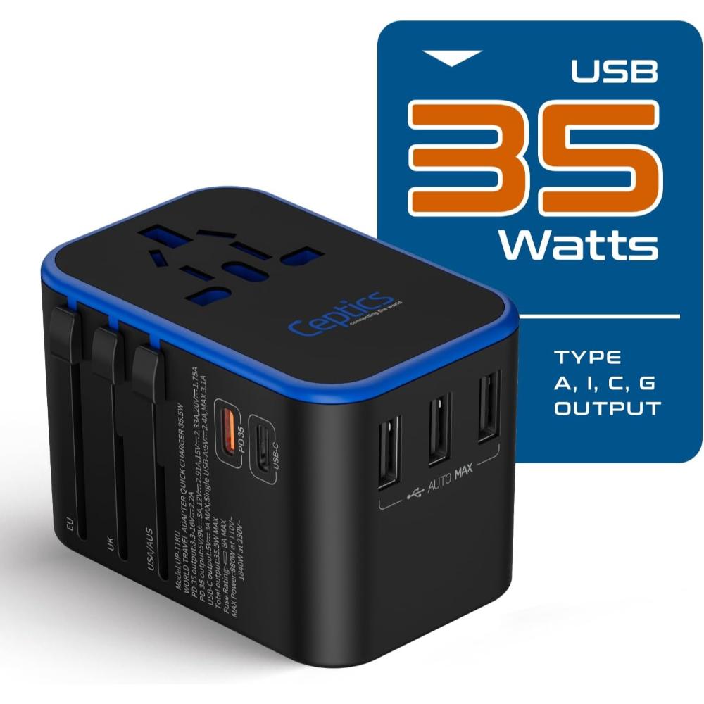 Este adaptador de corriente de viaje internacional permite cargar hasta 5 dispositivos al mismo tiempo, gracias a su entrada universal, 3 puertos USB-A (incluyendo 2 de 2,4A) y 2 puertos USB-C (uno con Power Delivery y carga rápida 3.0). Es compatible con teléfonos, iPhones, iPads, tabletas y otros dispositivos en casi todo el mundo. Incluye múltiples salidas: Tipo A (EE. UU., Japón, Canadá, México), Tipo I (China, Australia, Nueva Zelanda), Tipo C (Europa, Sudamérica, Asia) y Tipo G (Reino Unido, Irlanda, Singapur, Hong Kong), convirtiéndose en un compañero de viaje versátil y práctico.