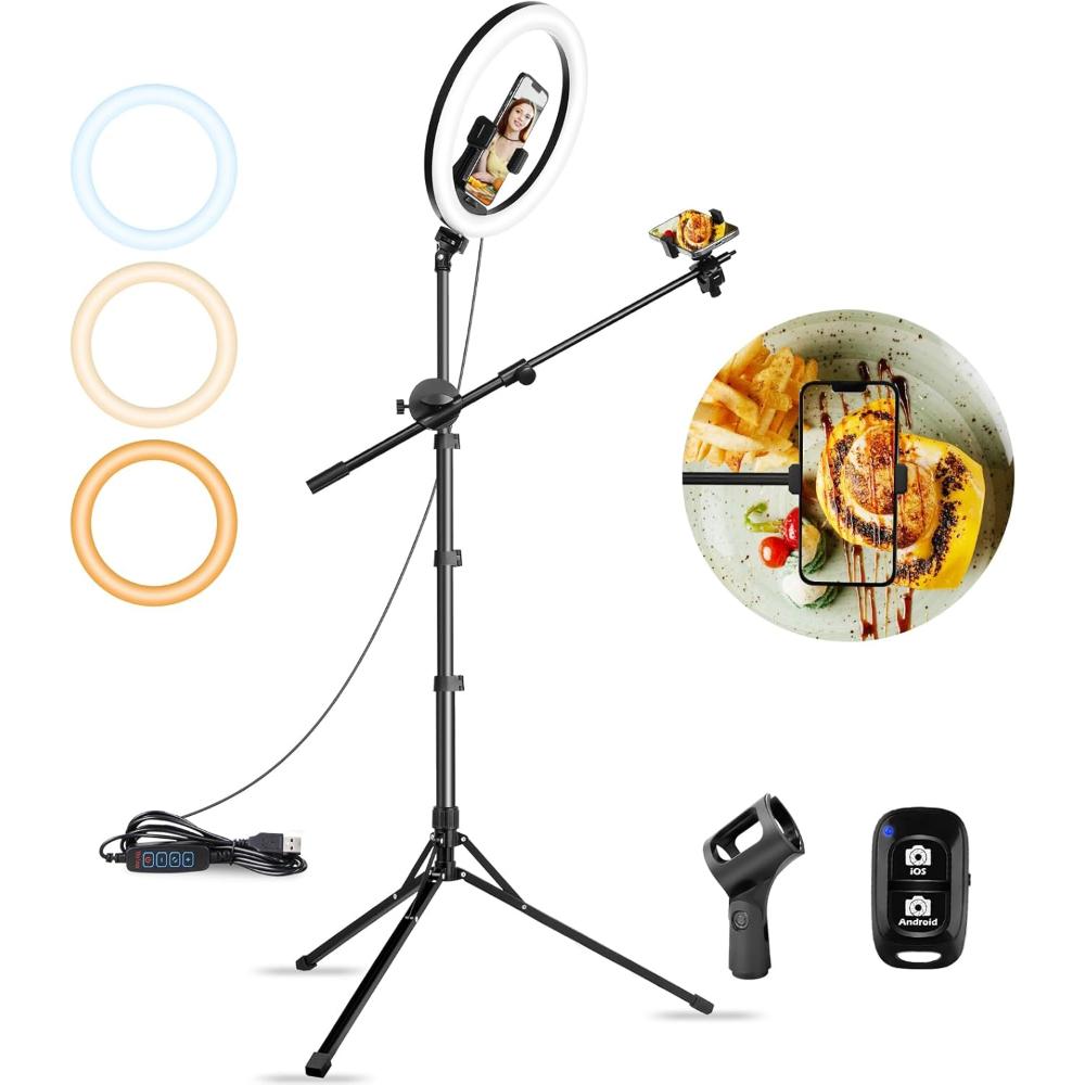 Anillo de luz superior de 12 pulgadas con soporte, luz de anillo regulable con soporte para teléfono y micrófono, trípode ajustable de 62 pulgadas para grabación de video.