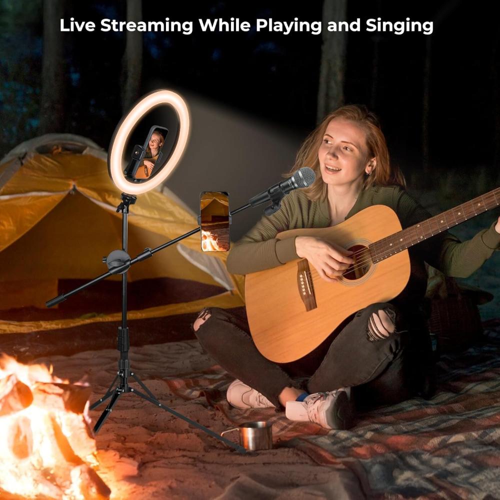 Este aro de luz regulable ofrece 30 combinaciones de iluminación gracias a sus 3 temperaturas de color y 10 niveles de brillo, con un CRI ≥95 que asegura tonos naturales y realistas tanto de día como de noche. Funciona mediante alimentación USB, lo que lo hace práctico para conectarlo a portátiles, power banks o adaptadores de pared. Además, incluye dos soportes para teléfono giratorios (en la luz principal y en un brazo ajustable) y un soporte para micrófono, ideal para grabar voz y video al mismo tiempo, siendo perfecto para vlogs, maquillaje, clases en línea o transmisiones en vivo.