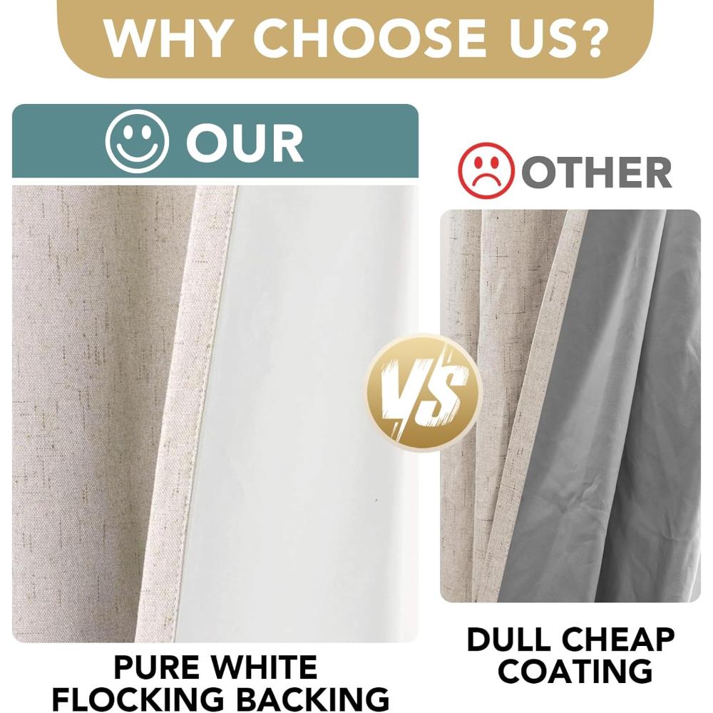 Panel opaco doble ancho (1 pieza de 100" × 84") con 16 ojales antioxidantes para barras de hasta 1.5". Forro blanco 100% blackout que bloquea luz y rayos UV, brinda privacidad total y protege los muebles del desteñido. Tejido tipo lino 100% poliéster con forro opaco: suave, con buena caída, ayuda a reducir ruido y bloquear corrientes de aire. Acabado de fibra recortada, sin arrugas, sin vinilo y de estilo casual, ideal para convertir el día en noche y dormir mejor.