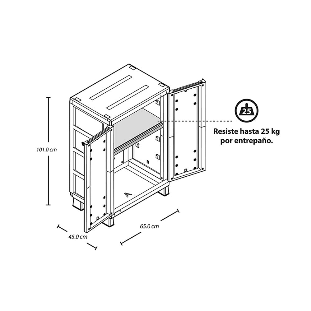 Armario Mediano con 2 entrepaños ajustables que resisten hasta 25 Kg cada uno. Fácil de armar, mover y limpiar. Con la resistencia y beneficios del plástico. Excelente capacidad interior, con orificio para uso de candado para mayor seguridad. De apariencia moderna y elegante. Ideal para interiores y exteriores. Beneficios: Manijas verticales. Mejor agarre y diseño. 2 Entrepaños regulables. Resiste hasta 25 kg por entrepaño. Fácil de mover. Fácil de armar. Diseño práctico y funcional que optimiza el almacenamiento. Fabricado con materiales duraderos y ligeros. Ideal para organizar ropa, juguetes y otros objetos. Estilo moderno que se adapta a cualquier decoración. Versátil para uso en varias habitaciones del hogar. Ayuda a mantener el espacio ordenado y accesible.