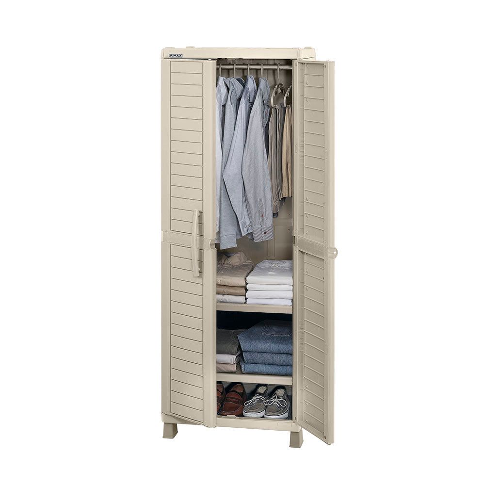Armario para Ropa con 2 entrepaños ajustables que resisten hasta 25 Kg cada uno, tubo en aluminio para colgar la ropa, con la profundidad ideal para colgar cómodamente cada prenda e incluye 6 ganchos RIMAX. Fácil de armar, mover y limpiar. Con la resistencia y beneficios del plástico. Excelente capacidad interior, con orificio para uso candado para mayor seguridad. De apariencia moderna y elegante. Ideal para interiores y exteriores. Beneficios: Manijas verticales. Mejor agarre y diseño. 2 Entrepaños regulables. Resiste hasta 25 kg por entrepaño. Fácil de mover. Fácil de armar. Amplio espacio para colgar y organizar ropa. Diseño moderno que se adapta a cualquier decoración. Fabricado con materiales resistentes y de calidad. Ideal para optimizar el almacenamiento en dormitorios. Fácil de limpiar y mantener. Compacto y funcional, ideal para espacios pequeños.