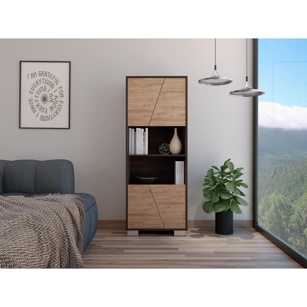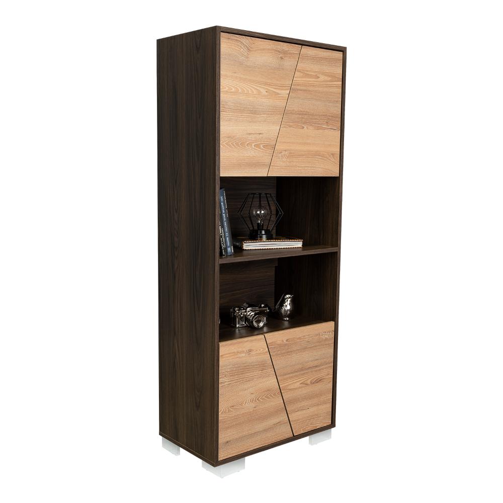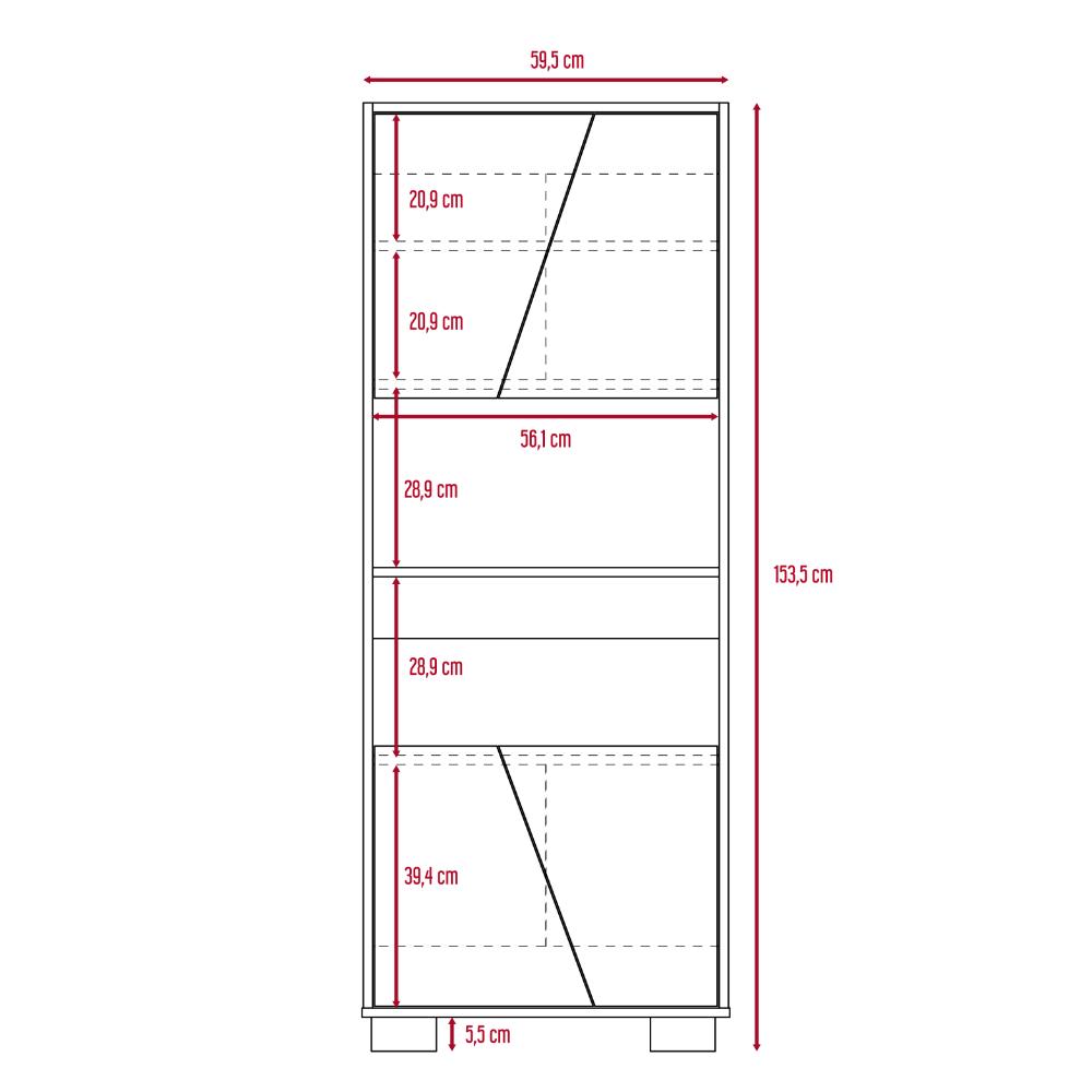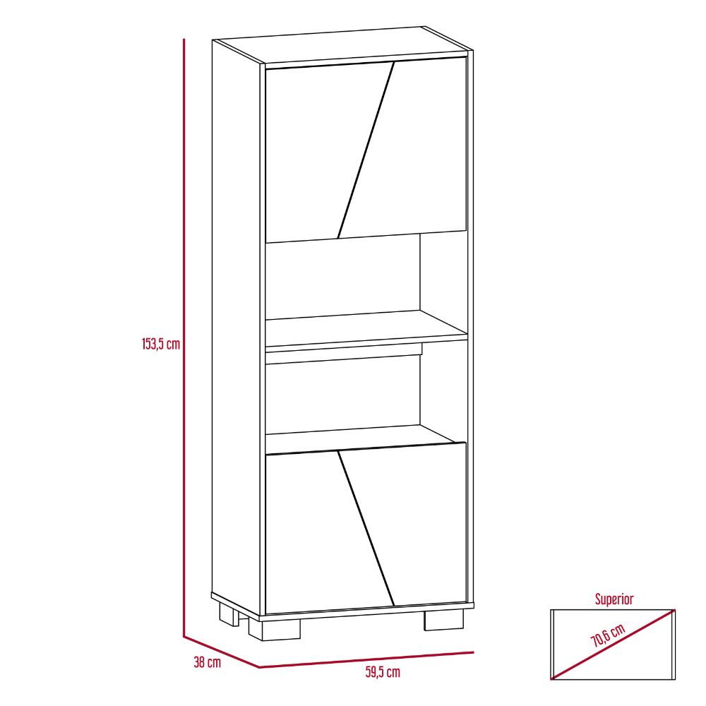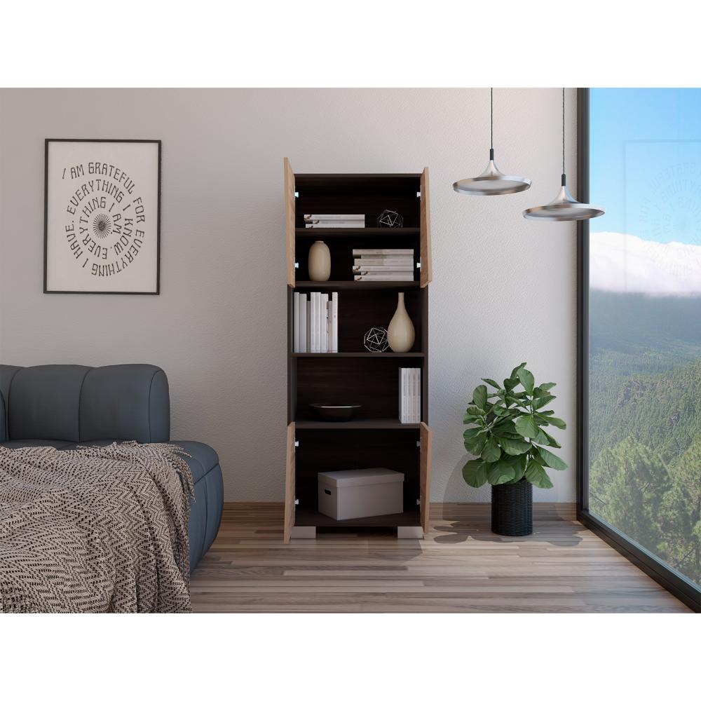 Biblioteca, con 4 puertas batientes, 5 entrepaños para ubicar objetos y patas metálicas.