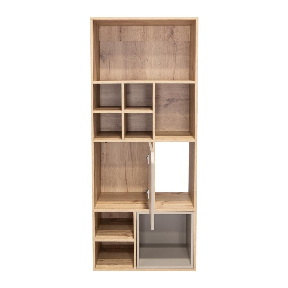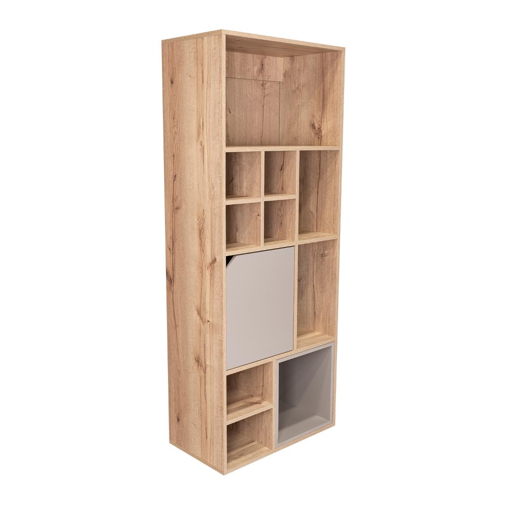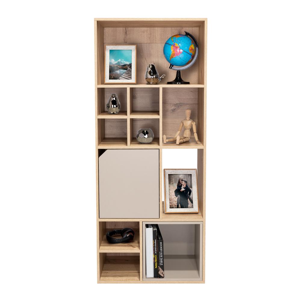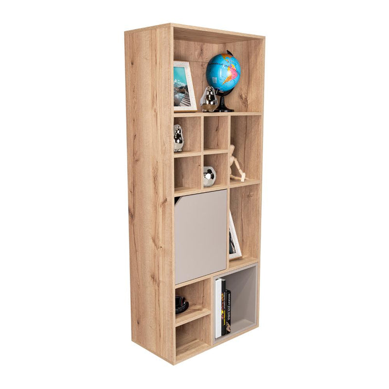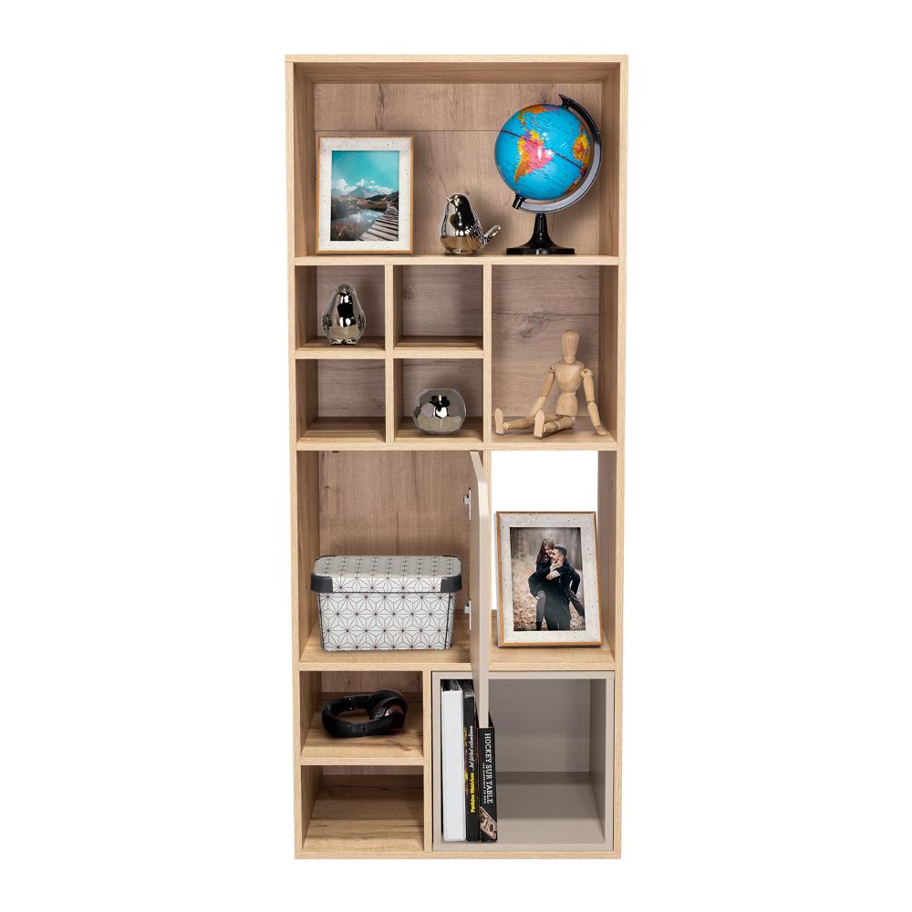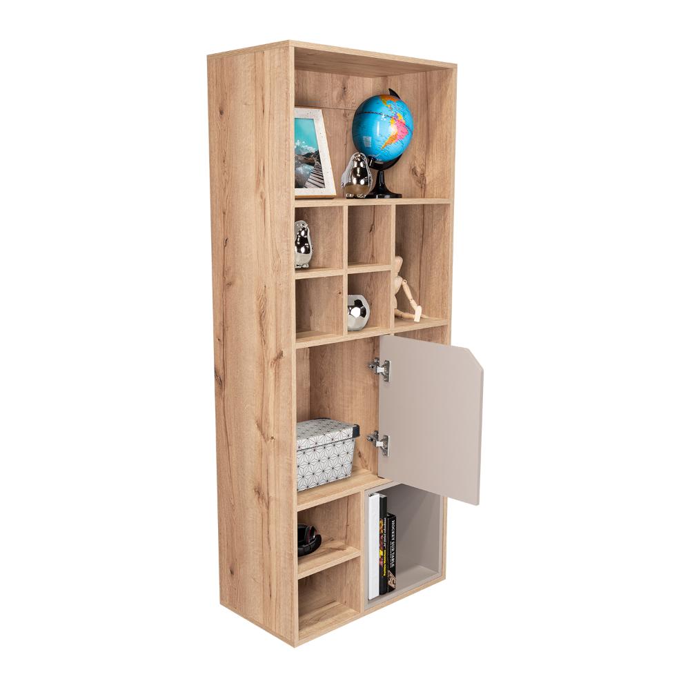 Biblioteca, con 1 puerta batiente y múltiples entrepaños y superficies para ubicar objetos.