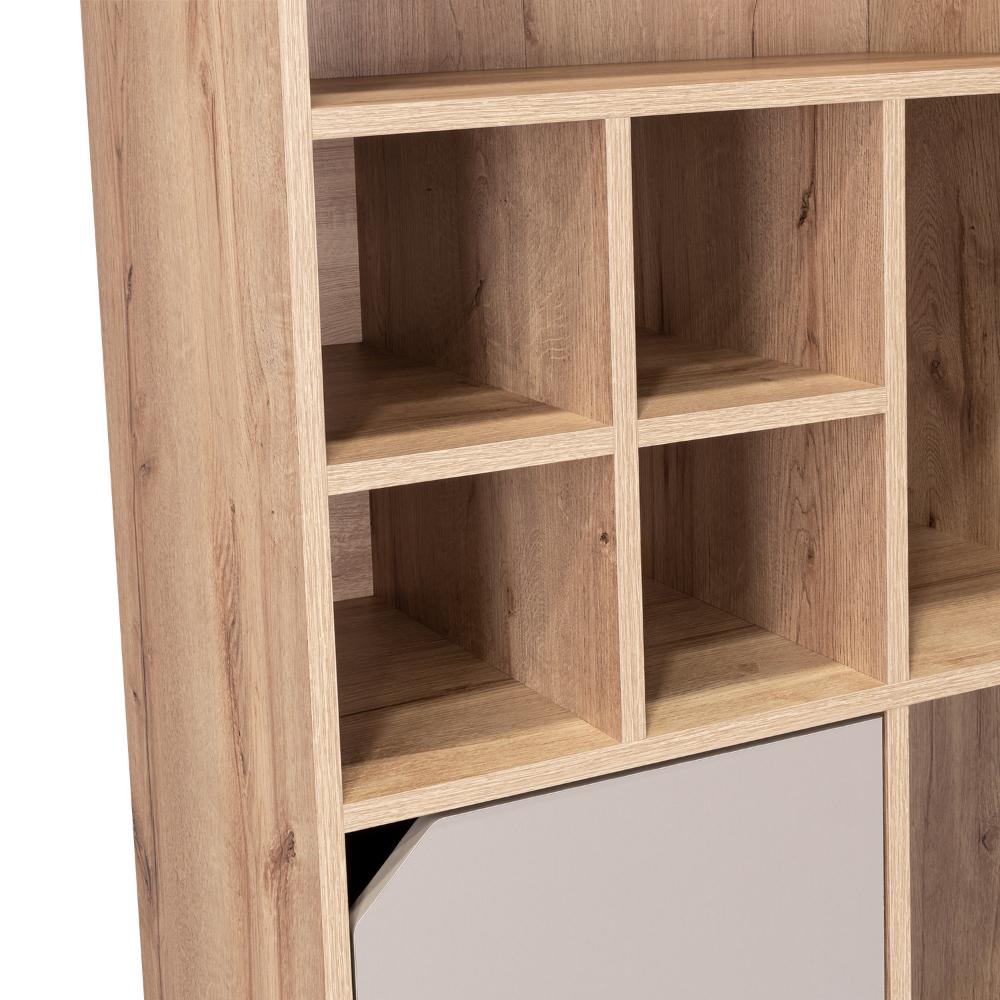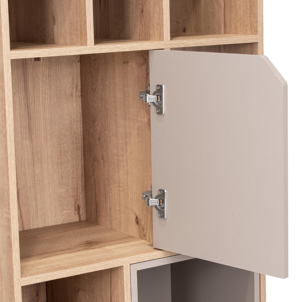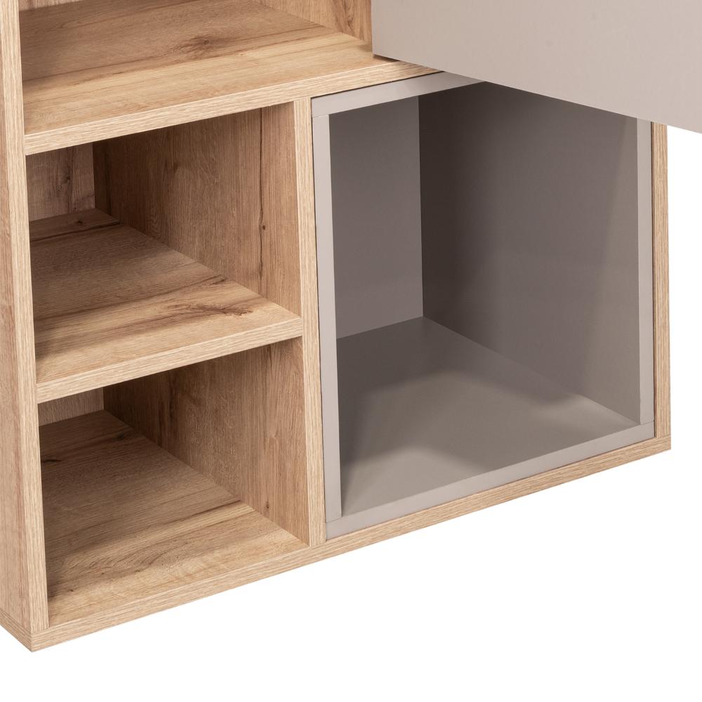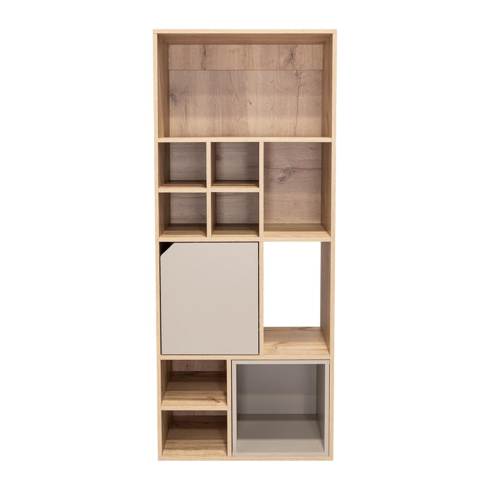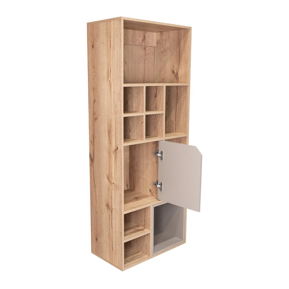Biblioteca, con 1 puerta batiente y múltiples entrepaños y superficies para ubicar objetos.