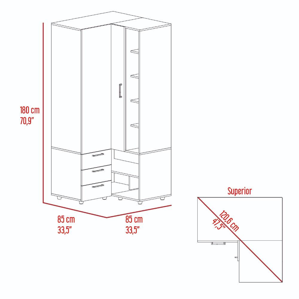 Closet esquinero con dos tubos cromados para colgar ropa, tres cajones, múltiples espacios de almacenamiento.