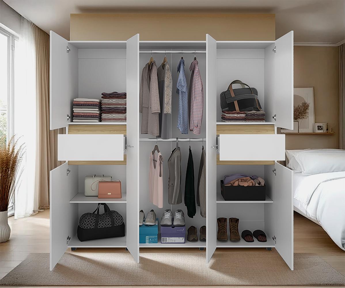 Closet, con seis puertas batientes, dos cajones, dos tubos para colgar ropa y amplios espacios de guardado.