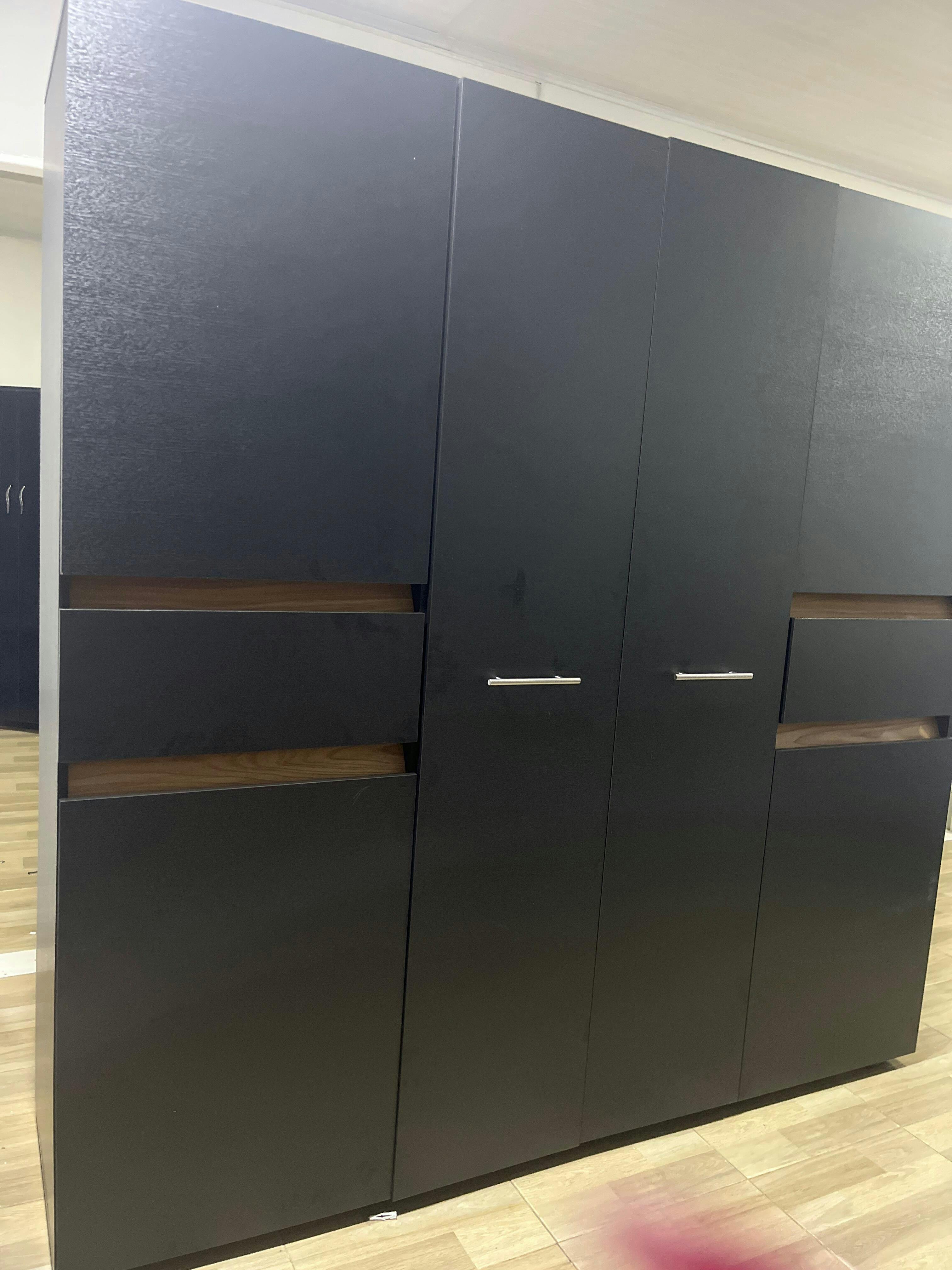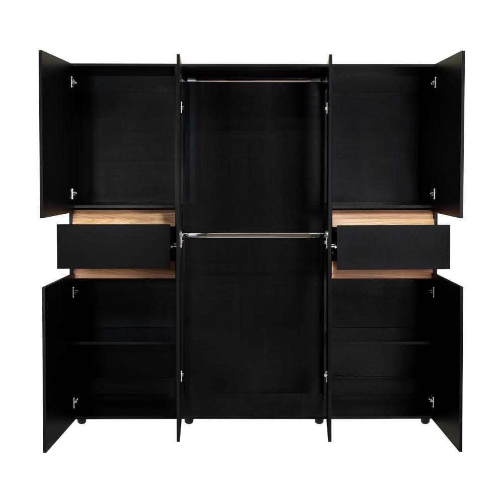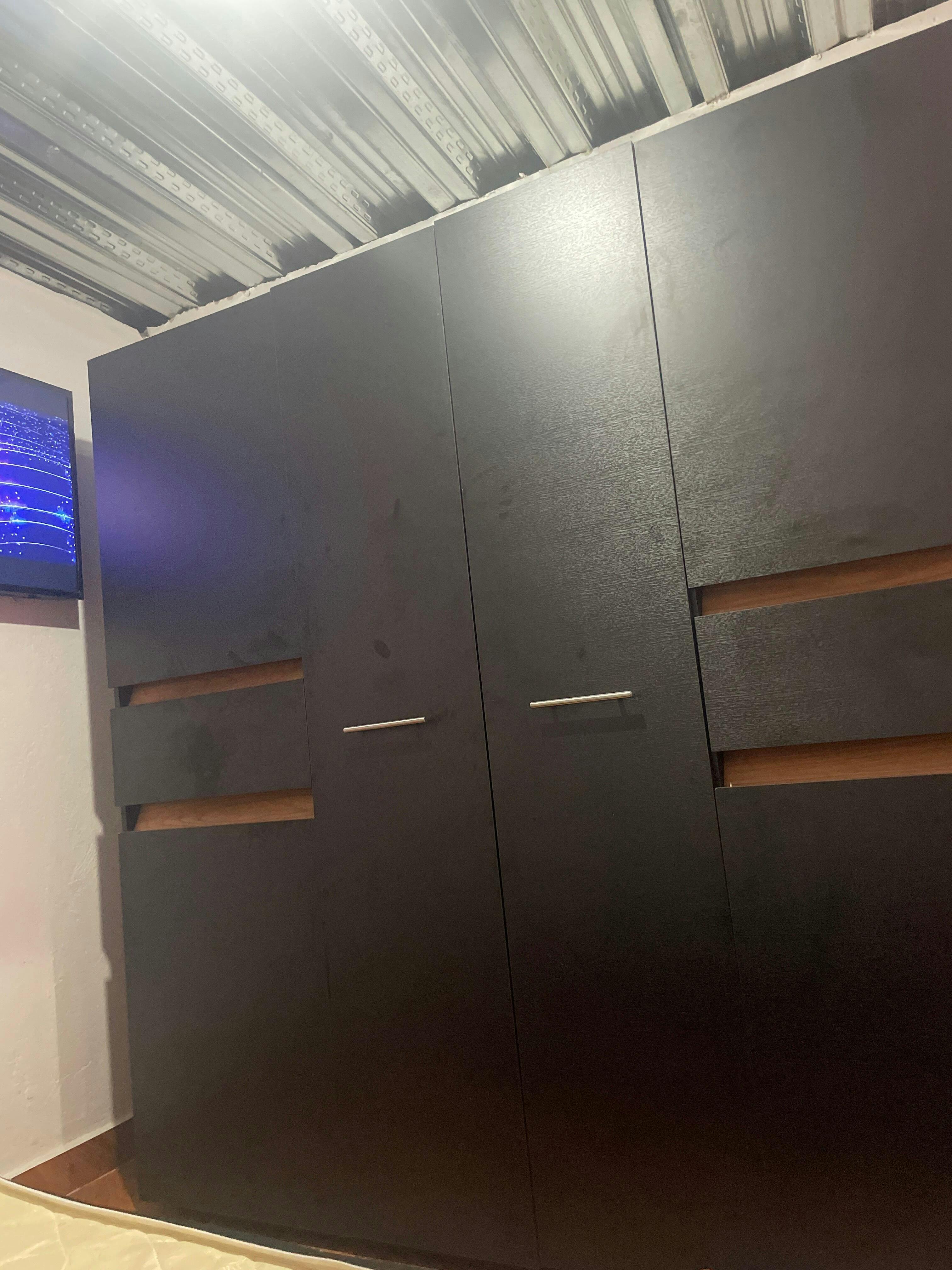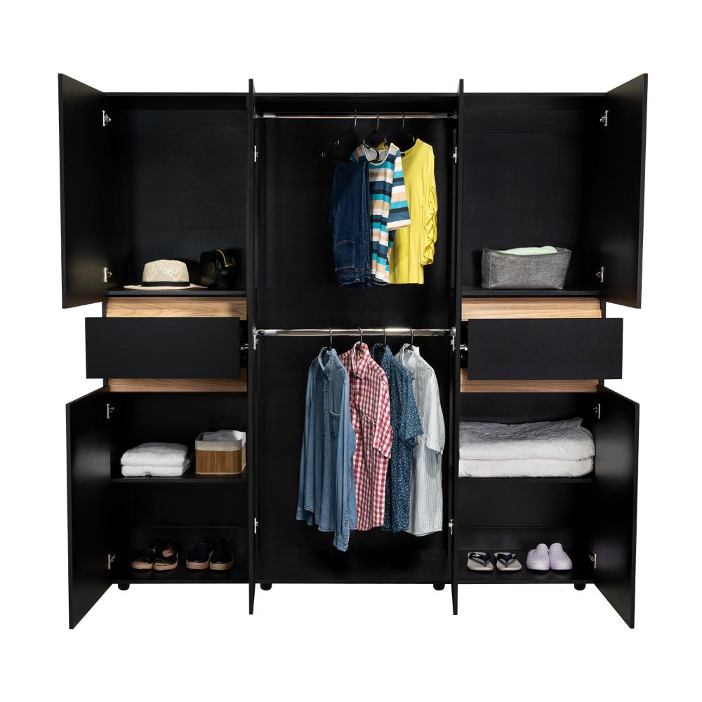 Closet, con seis puertas batientes, dos cajones, dos tubos para colgar ropa y amplios espacios de guardado.
