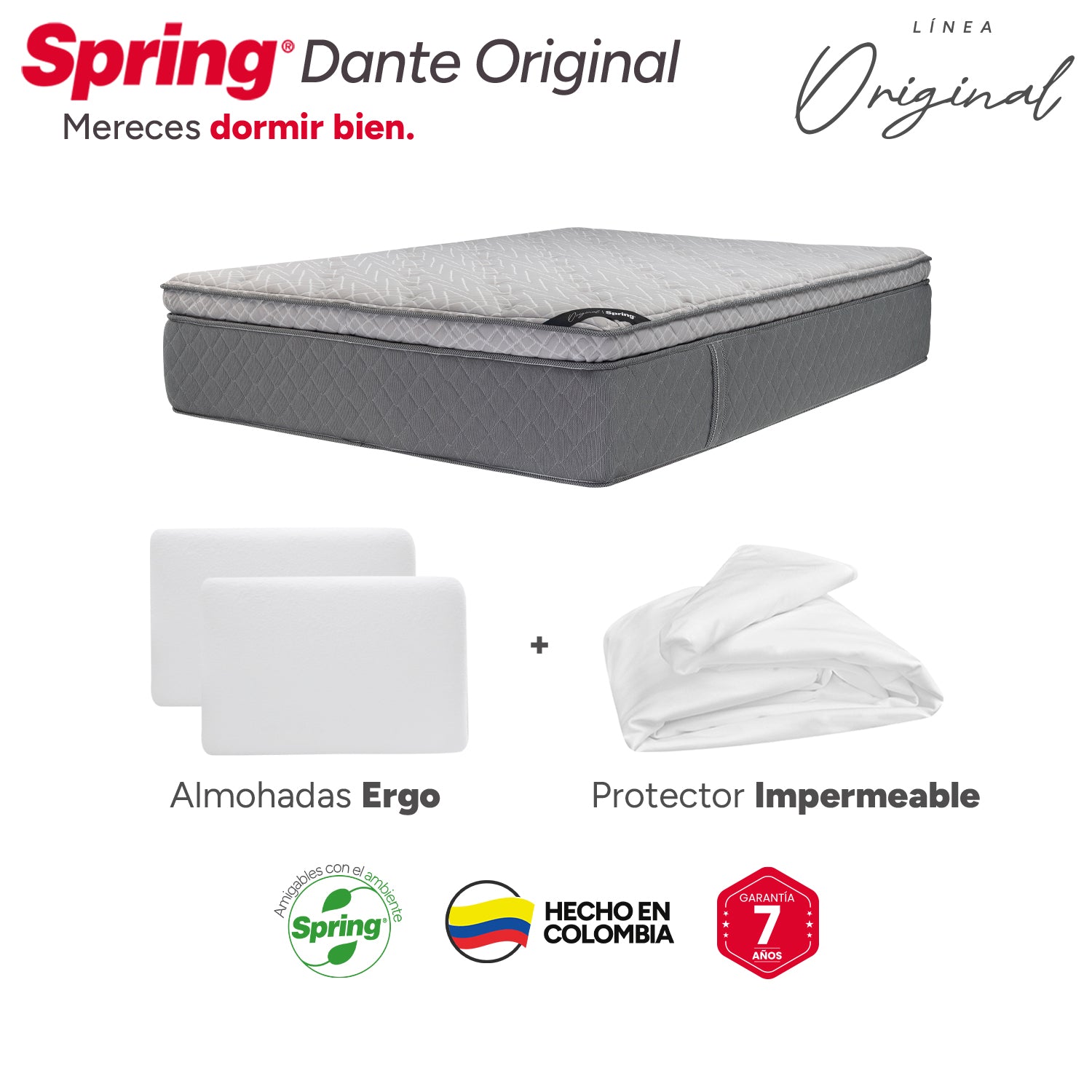 Colchón Spring Dante Original Queen 160X190 Cm+ Set Almohadas Ergo + Protector