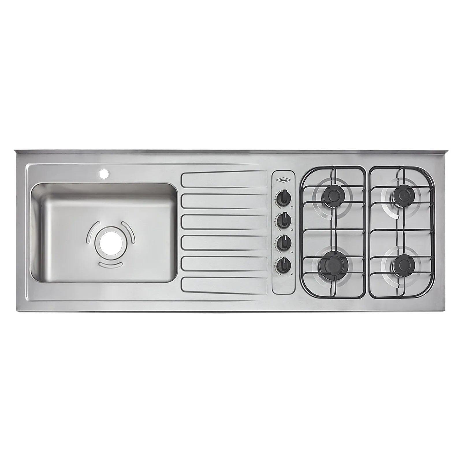 Mesón en acero inoxidable de 1.50 metros de ancho, con ubicación izquierda del pozuelo. sin encendido, 4 fogones a gas natural con parrillas en alambrón con puntos de apoyo óptimos por recipiente para más seguridad. Cuenta con un sistema de anti-empozamiento en el lavaplatos y prensado en el centro del mesón que evita la acumulación de agua y el desplazamiento de líquidos al interior del mueble.