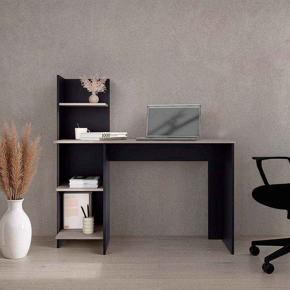 Escritorio, con amplia superficie de trabajo, entrepaños para ubicar libros y/o elementos decorativos, combinación de colores.