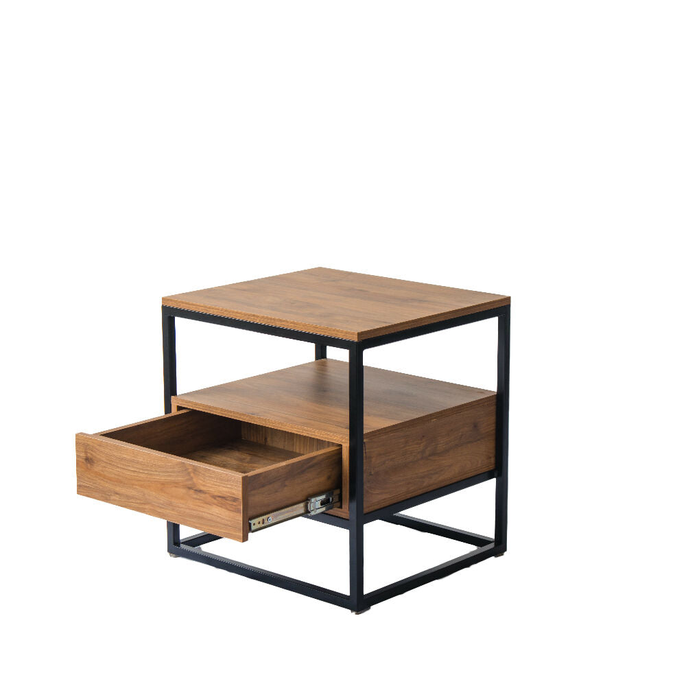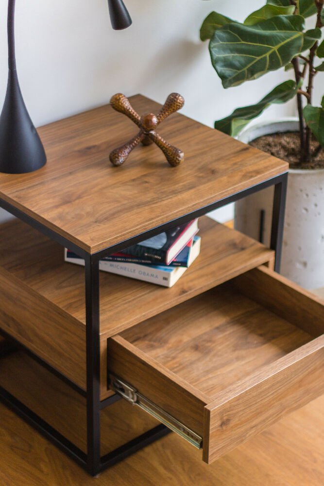 Estructura en tubería de hierro cuadrada de 3/4 pulgada, con un cajón amplio para y con riel de cierre lento, melamina RH de 15 mm de espesor y acabado en pintura electrostática negro mate liso.