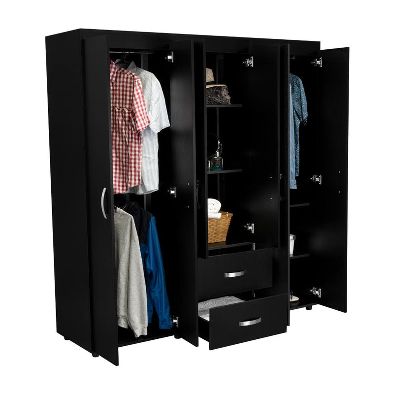 Mueble, con amplios espacios y entrepaños para organizar, 6 puertas abatibles, 3 tubos cromados, 2 cajones organizadores, y deslizadores de plástico para apoyo al piso.