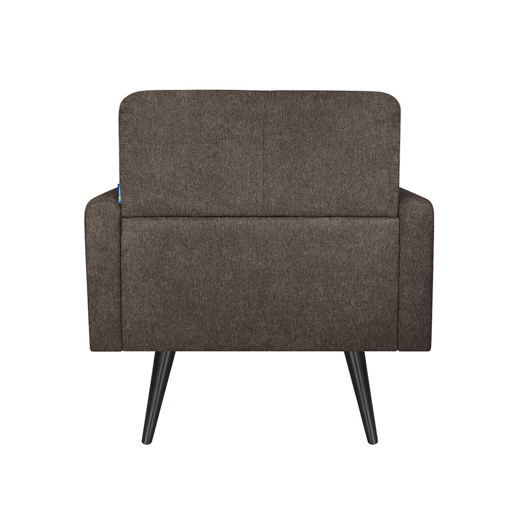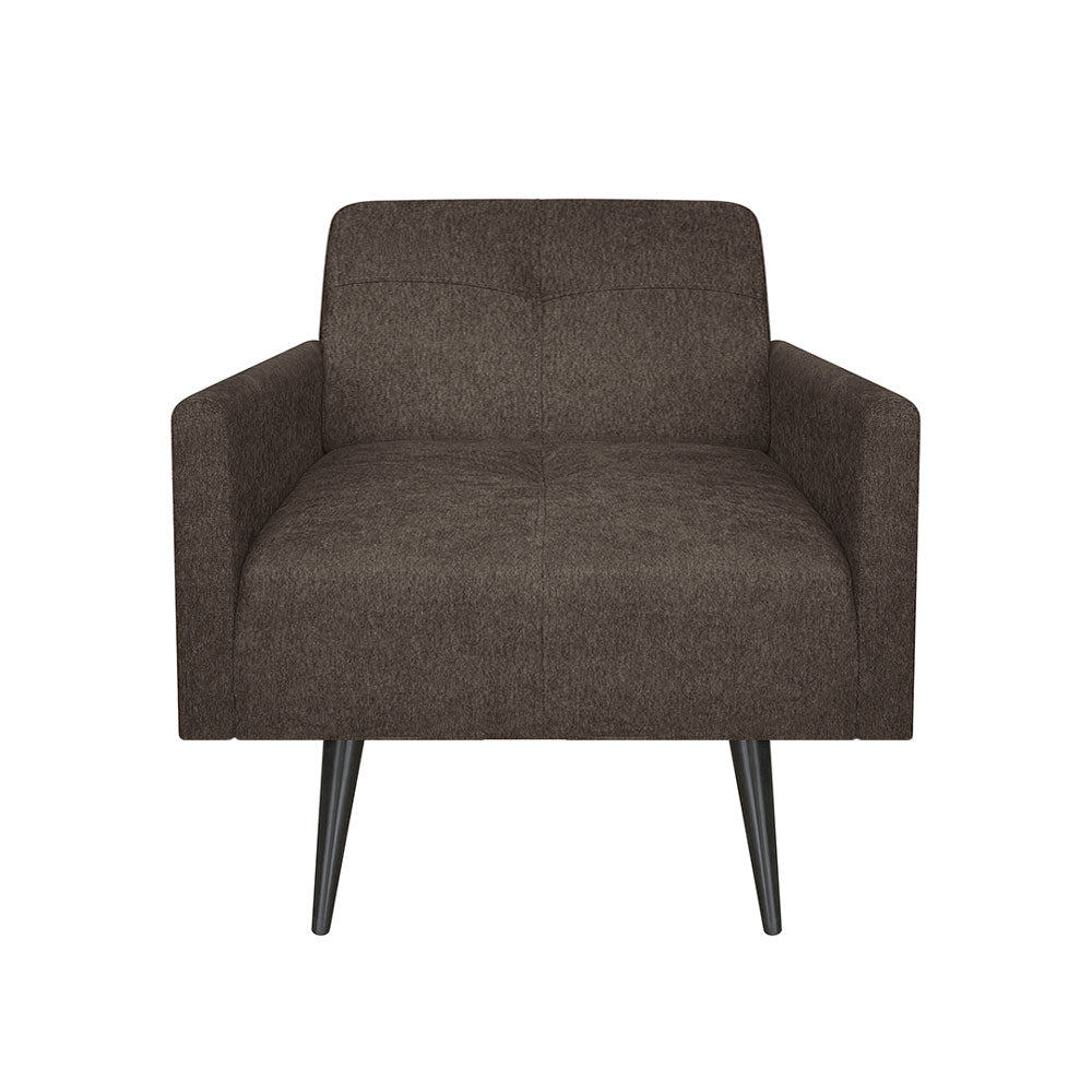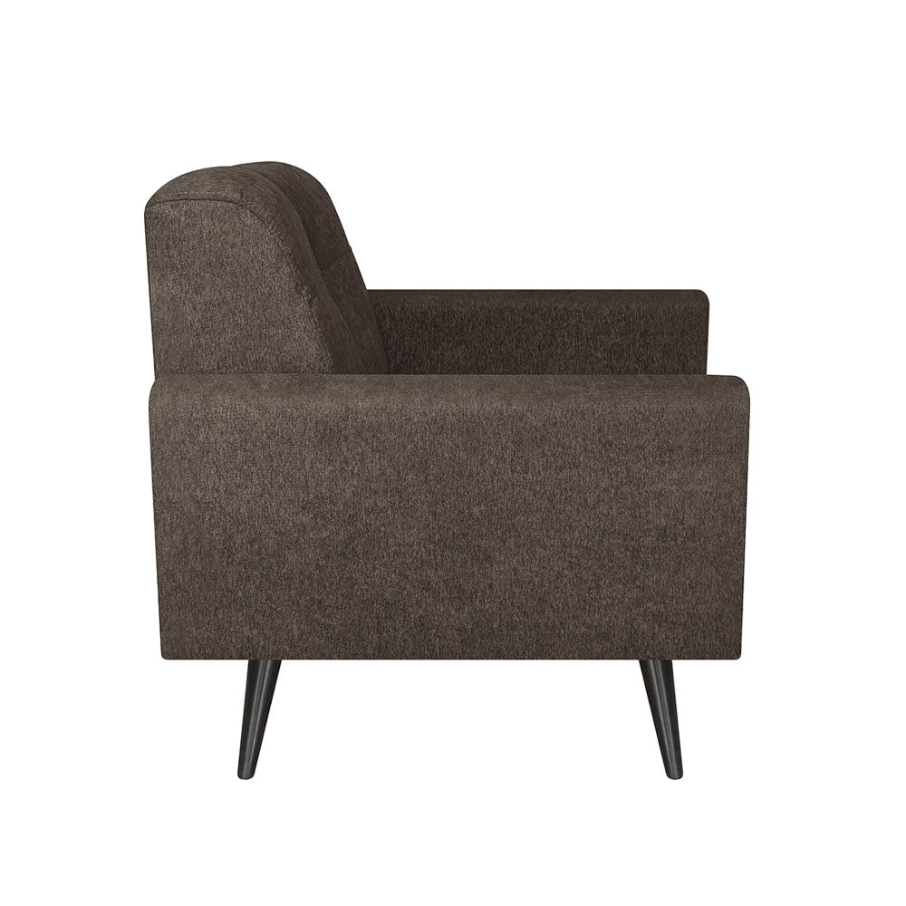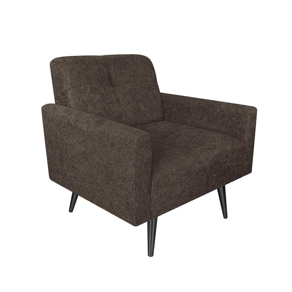 Con un diseño contemporáneo y elegante, esta poltrona se integra sin esfuerzo con cualquier tipo de decoración. Su estructura baja, con reposa brazos y espaldar acolchado capitoneado al centro, brinda una apariencia moderna y acogedora. Las patas largas en madera, colocadas en ángulo, aportan estabilidad y un toque distintivo que realza su estética.