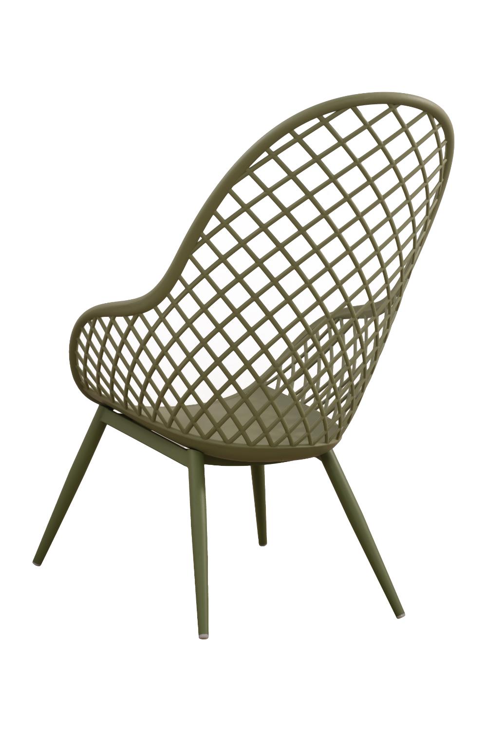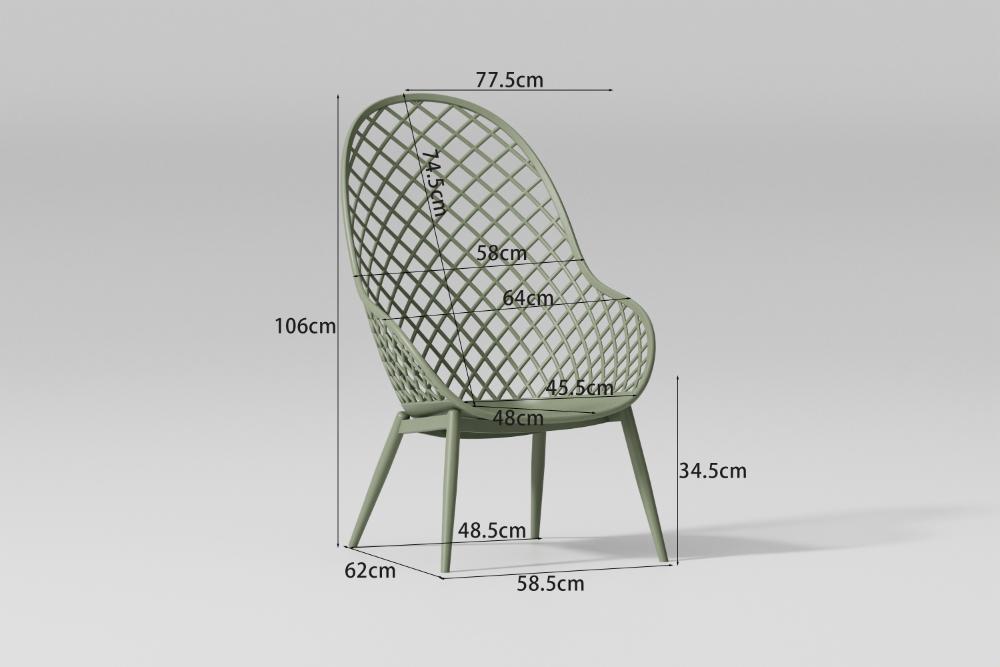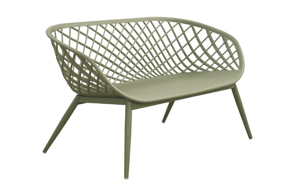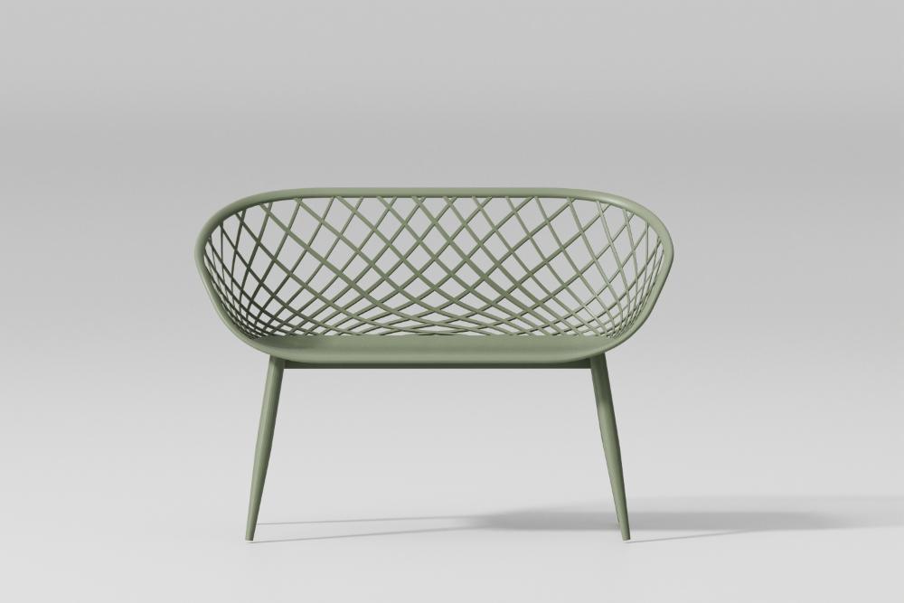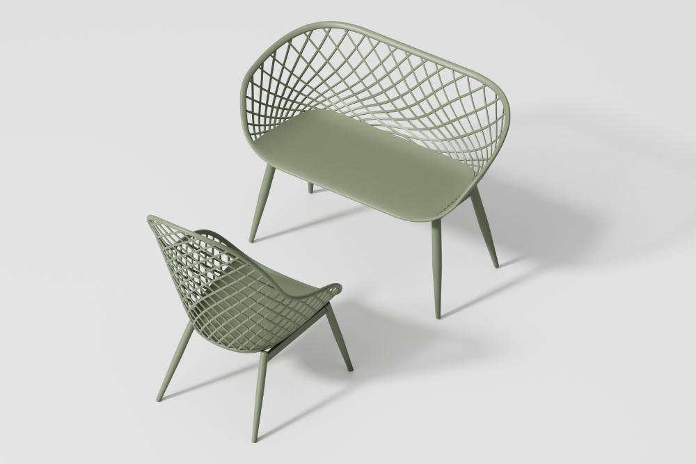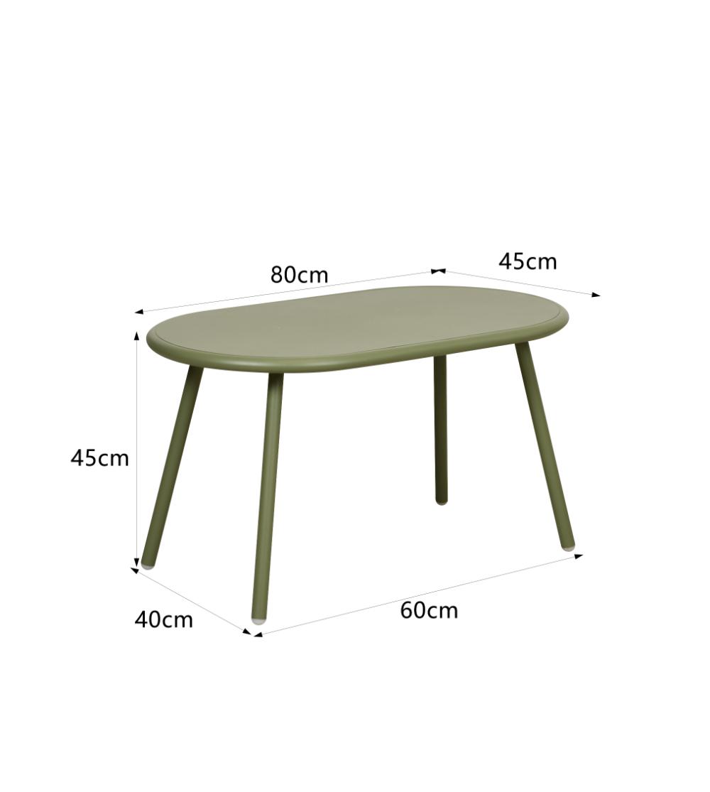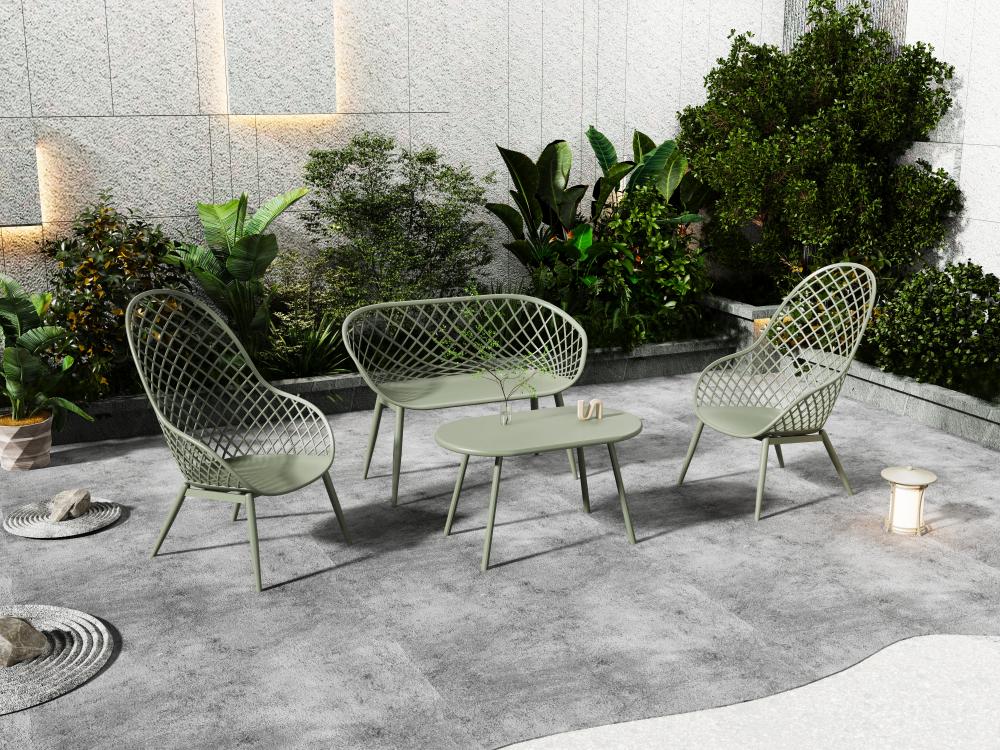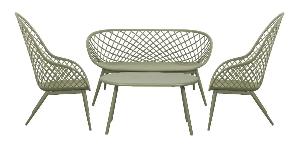 Elaborado en Polipropileno y protección a los rayos UV el set incluye mesa centro, dos sillas y un banco, en Color Verde Olivo