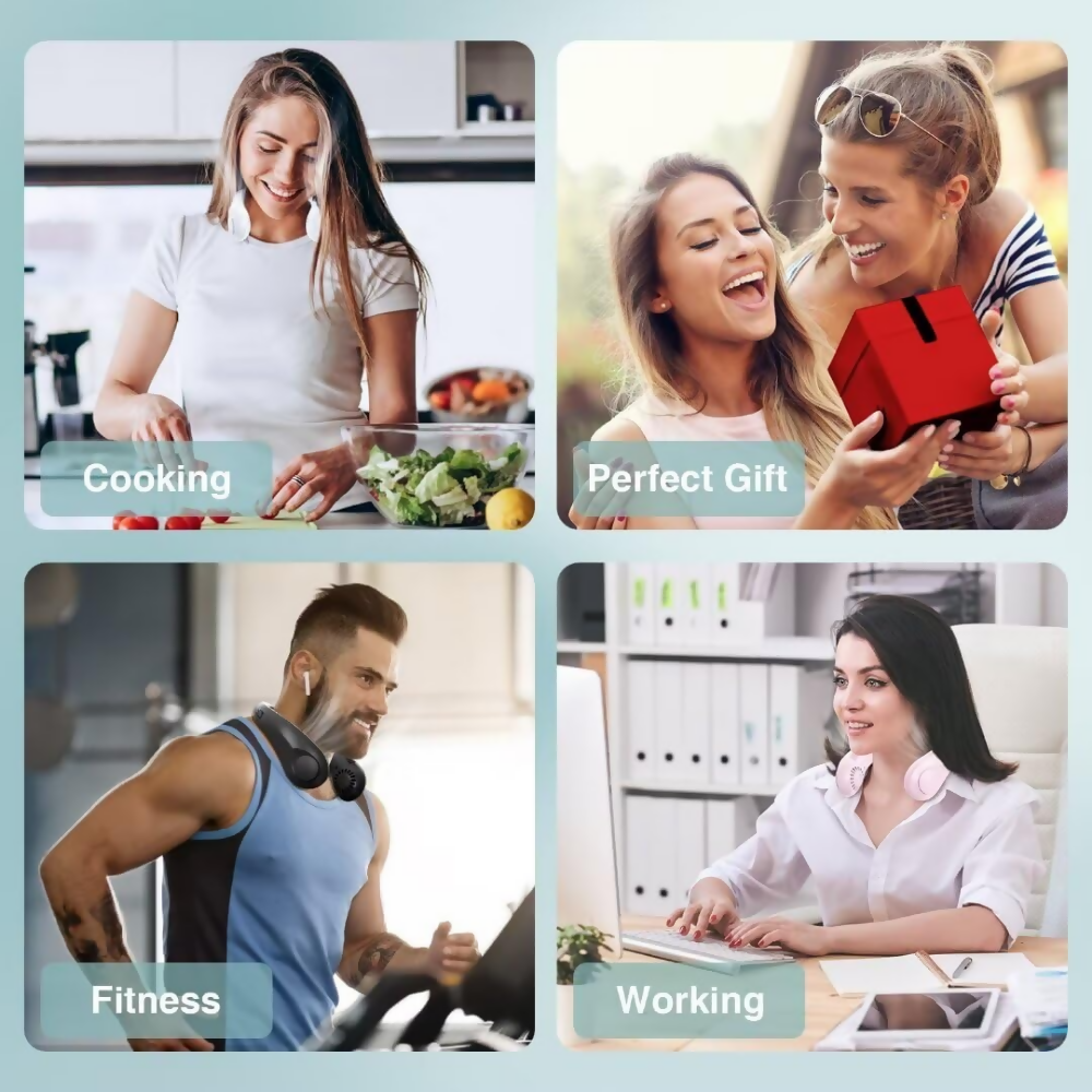 Este ventilador de cuello portátil y recargable es perfecto para mantenerse fresco en cualquier situación. Con su diseño ergonómico y ligero, se ajusta cómodamente alrededor del cuello, permitiendo una brisa constante sin necesidad de usar las manos. Además, su diseño silencioso y discreto lo hace perfecto para cualquier entorno.